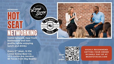 No cost networking in downtown Meridian while supporting local business and connecting with other professionals. Bring a friend, order $5 tacos, and learn from the hot seat.